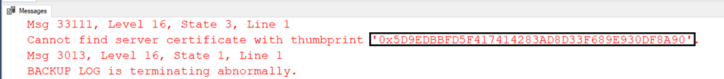 Cannot find server %S_MSG with thumbprint ‘%.*ls’.