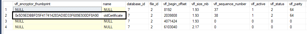 use dbname go select vlf_encryptor_thumbprint,c.name, l.*From sys.dm_db_log_info(db_id()) l left join master.sys.certificates c on l.vlf_encryptor_thumbprint=c.thumbprint